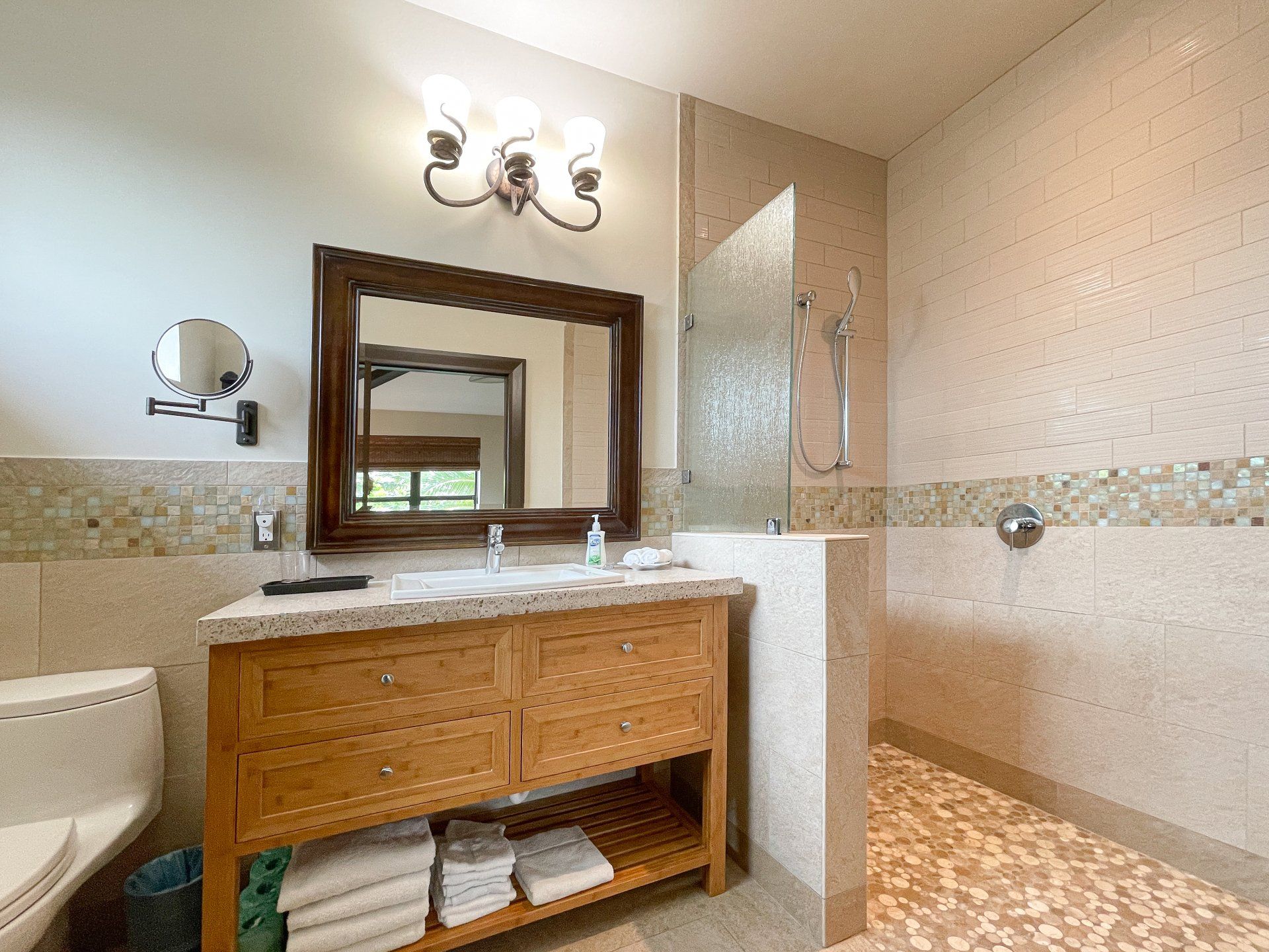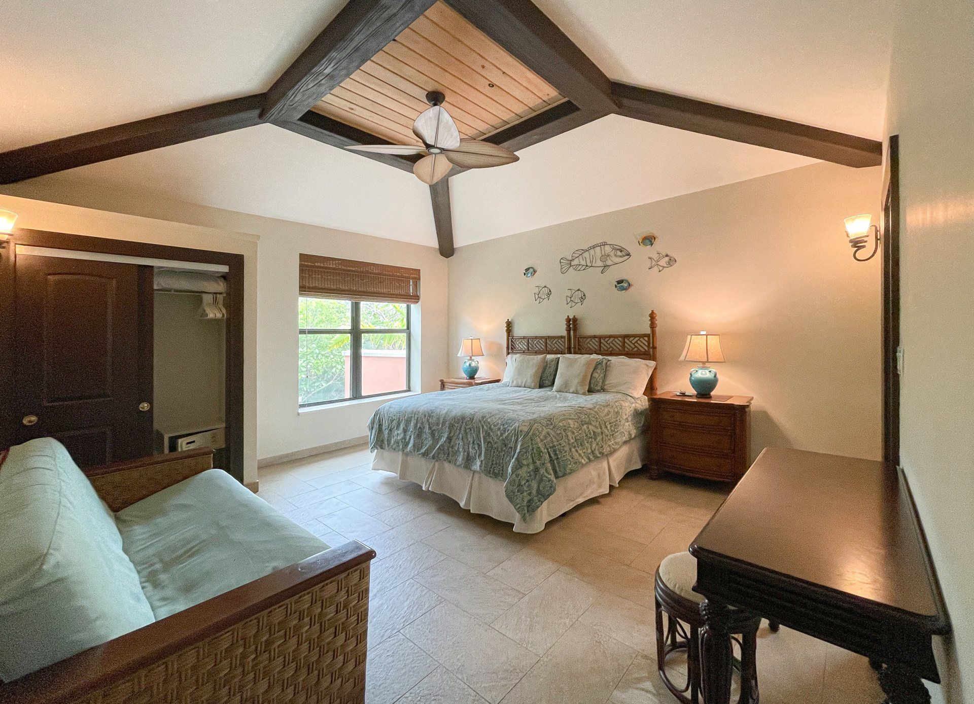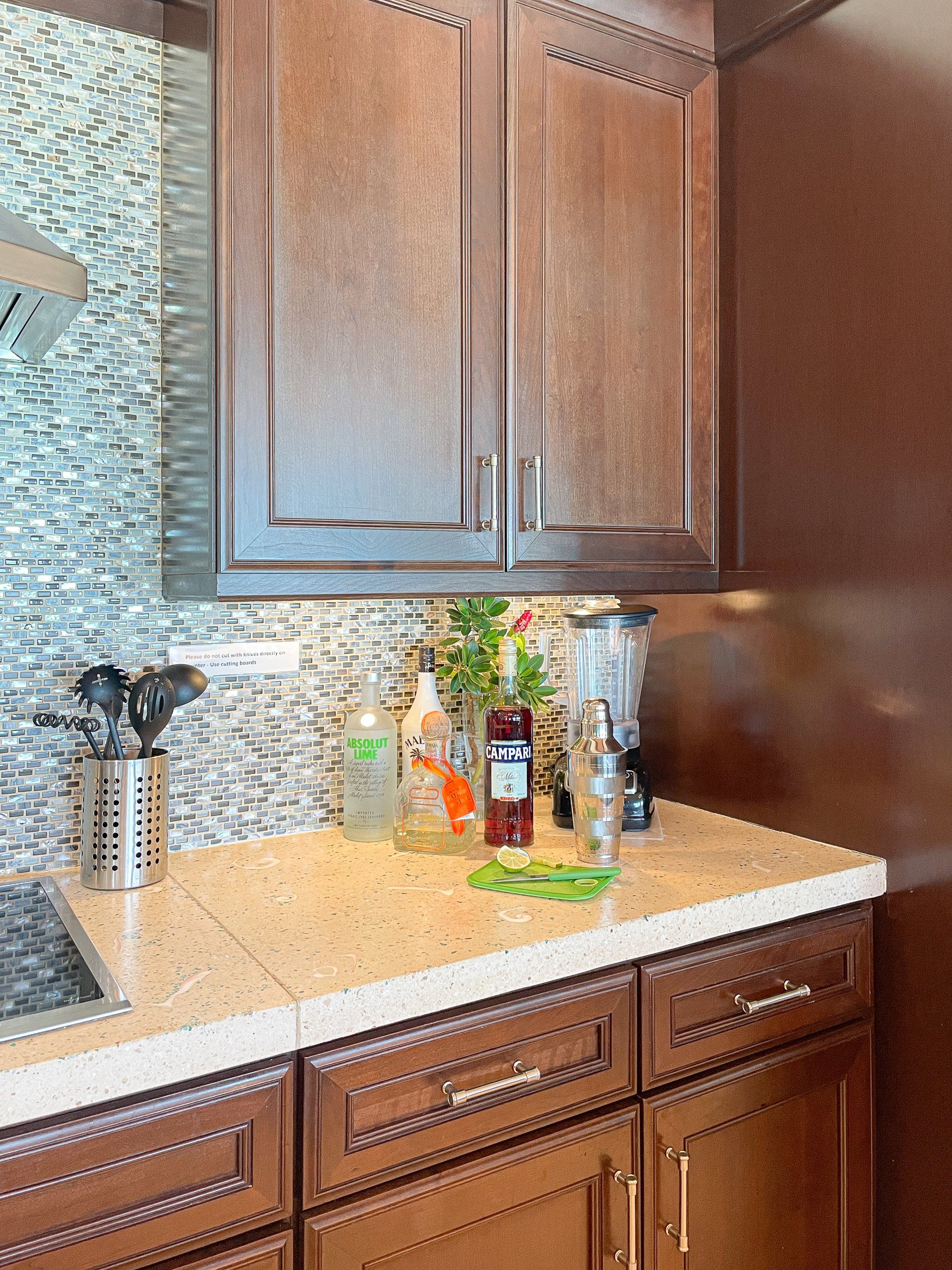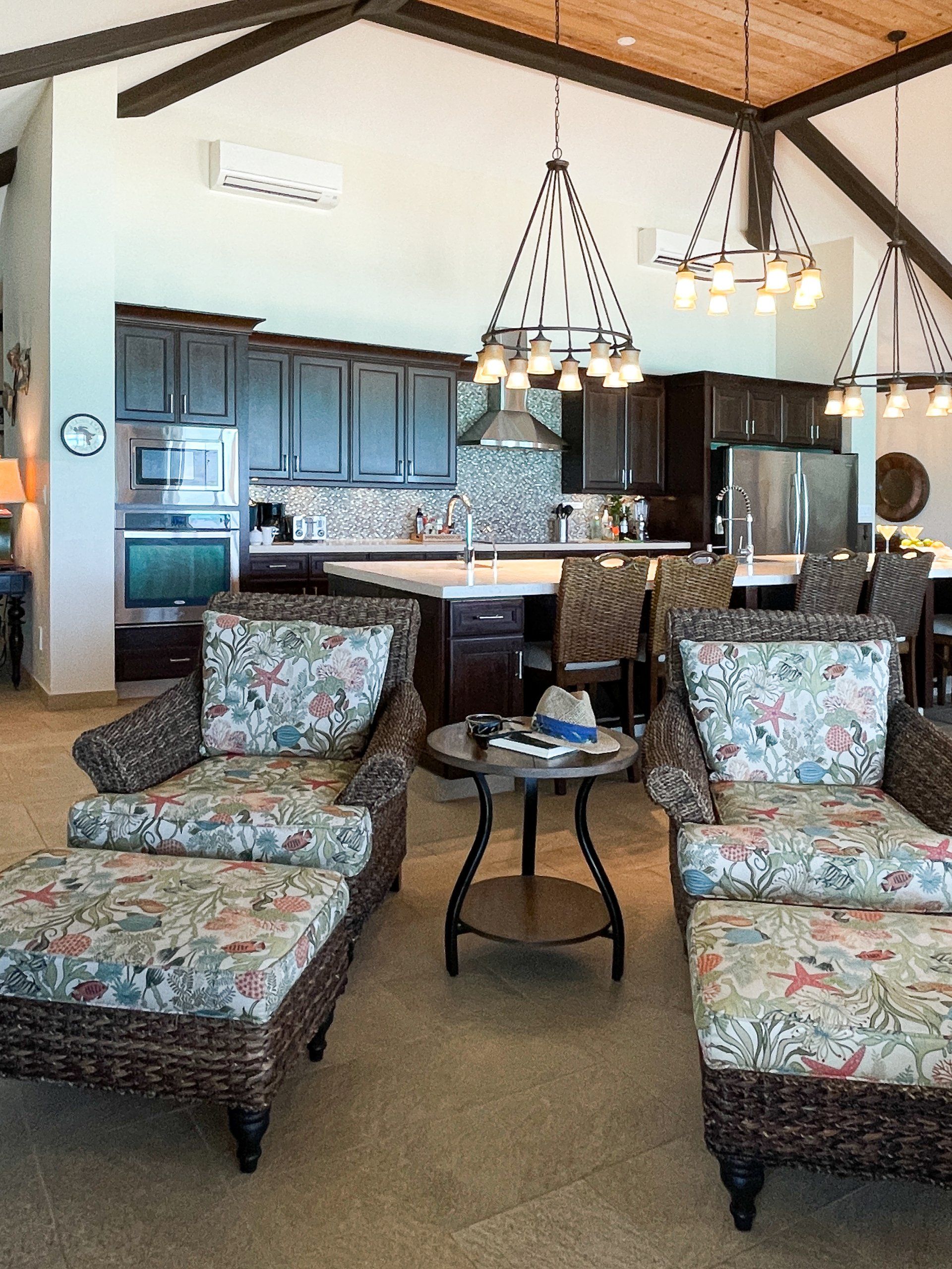 High quality Tommy Bahama and Sunbrella furnishings, memory foam mattresses, Hotel grade linens and towels, kitchen appliances and kitchenware all included. Italian porcelain tile throughout, Kraftmaid maple cabinetry, custom countertops with imbedded shells and beach glass.